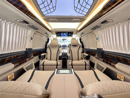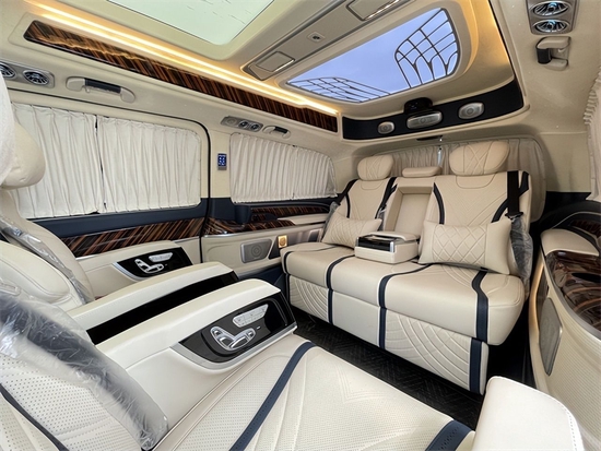 三排座椅电动调节三连座设计,配合旋转的二排座椅可以180度放平变成一张舒适的双人床,单独打开三排座椅也可以变成一张供您休息的超大单人床。为您的长途行程提供充足的睡眠。本款奔驰V260L商务车的顶灯部分运用的是迈巴赫圆弧形顶灯设计,材质采用美国进口石英水晶,通过镶嵌式总控进行控制,三色可变,营造出舒适氛围。