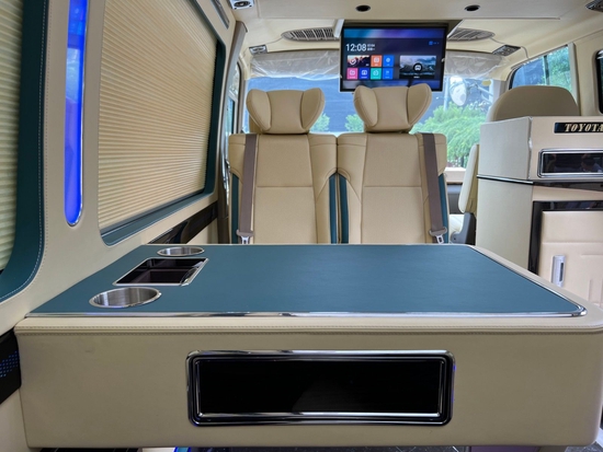 丰田考斯特12座改装商务车,除了座椅的改装以外,车内隔断的增加也是别有一番风味的,隔断的增加,将驾驶席和乘客席分开而设,同时我们可以在隔断上增加一些精美的装置,电子时钟,或者显示屏,方便有使用。隔断的效果最主要还是分离了司机和乘客,既能够给司机一个安静的驾驶环境,同样也为乘驾人员提供了更加静谧的乘车空间。