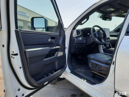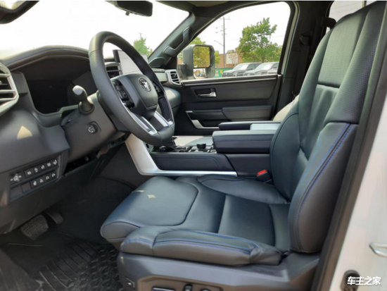 2022款丰田坦途座椅提供有皮质包裹,整体的造型也非常宽大,在中央扶手区域的设计上也采用了非常方正的造型设计,并且可以看到前排的储物空间设计还是非常丰富的。