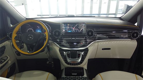 奔驰V260在内部装潢上也进行升级,车体提供意大利进口真皮(小牛皮)、Alcantara以及木材和碳纤维多种材质可供选择。而MPV车型看中的合金踏板、合金门把手以及内装台板等这款车都有所配备。科技配置还有AppleTV、两个15.6英寸显示屏、蓝光播放器以及DVB-T信号接收系统等。