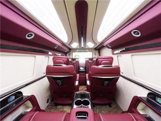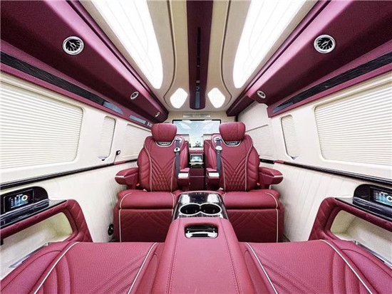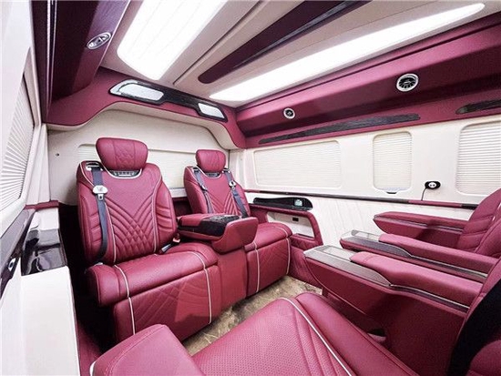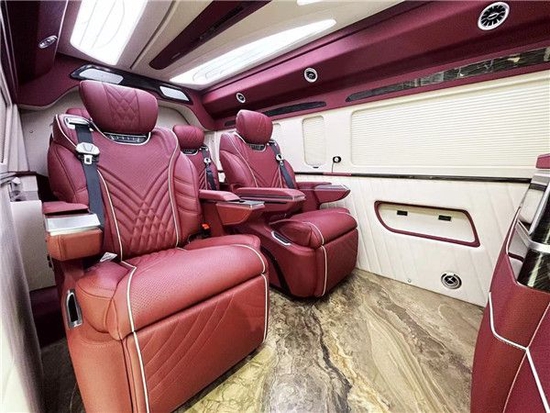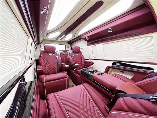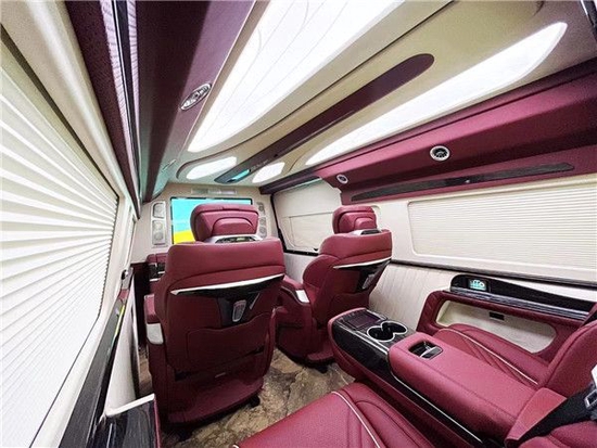 商务车基本的两个航空座椅,外加一个沙发床,这属于必备品了,航空座椅带有通风,旋转,按摩,加热腿托的所有功能,而且做了深度的包覆,乘坐体验感绝佳,第三排的沙发床既可以当成两个独立的座椅使用,在必要的时候,完全可以180度放平,日常的休息区域就此形成。