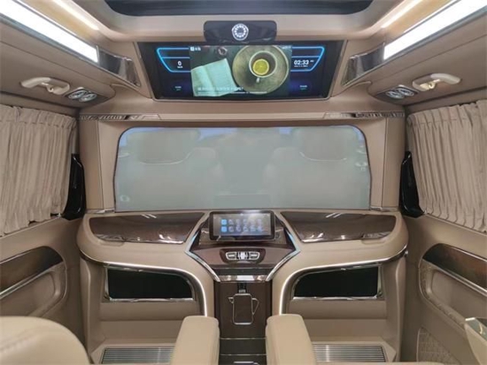 第三排座椅采用迈巴赫式的设计,中控扶手下方即是两张独立的航空座椅,并且这两个座椅是分开调节互不影响的。第二排旋转与第三排形成卡座设计,搭配脚下金碧辉煌的奢石地板,让我们有如身处豪华会议室般的感觉。