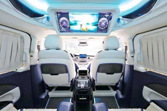 奔驰V250改装商务车2+2+3座椅,也是商务车最为流行的座椅布局,第二排航空座椅,打孔真皮处置更透气,座椅透风、推拿赐与您更温馨的乘坐感触,更有360度扭转功用,无论是家庭出游照顾孩子、陪家人谈天,亦或是商务洽谈,都能让您随心所欲,第三排座椅打开,便可构成一张宽大温馨的沙发床,方便乘车人员休息。
