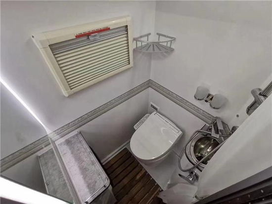 卫生间位于厨房区与车尾床之间,配置有电动粉碎马桶带松下智能马桶盖,支持清洗、加热等功能,家里有老人使用起来也是非常舒适,抽拉水龙头、镜子、淋浴花洒、洗水池、晾衣绳、换气扇等,此外还配有美的全自动壁挂式洗衣机,可谓说是配置非常丰富了。