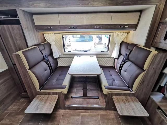 车内部分采用中式的家居风格,更符合中国人的审美,会客厅部分采用的是对座式沙发卡座的设计,直径达到了1.95m做到了行业内最宽,两个成年人面对面坐不会碰到腿。车内储物空间同样十分出色,会客厅上方拥有4组吊柜,后尾部3组,沙发卡座下方同样是储物空间,加上超大的储物仓大概拥有2500L的储物空间可供使用。卡座往后是一台赛特福德的152L双开门冰箱,保证车内能吃到新鲜食才就靠它了。