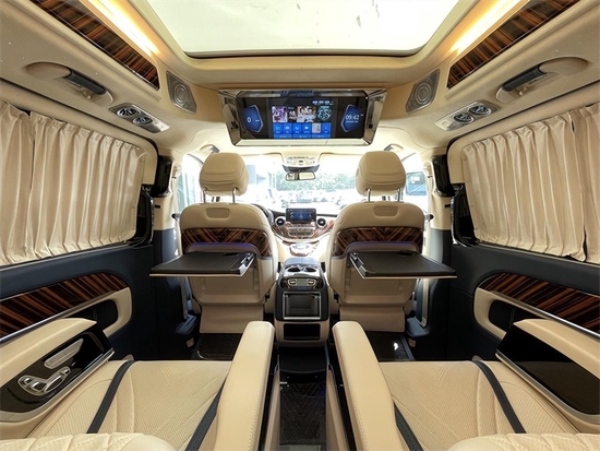 电动双开门带有自动防夹功能,车内进行了隔音降噪处理,创造了一个静谧舒适的环境,方便商务会议,办公和学。整车内饰改装下来,彰显出了车主卓尔不群的尊贵身份和独特品味,匠心设计体现在每一处细节上,商务车内饰升级绝对是商务精英人士的不二之选。隐藏折叠小桌板,办公娱乐两不误。