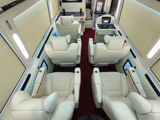 改装后的丰田考斯特整车内壁经过高档真皮包袱,且搭配桃木等高档装饰,地面则换成高档阻燃地毯或者更加豪华的游艇木地板,最后添加车厢隔断,车内氛围宛如置身移动的高级会所或者豪华私人飞机。灯光改装前后同样天差地别:原车灯光为普通高档的白炽灯,仅能提供夜间照明作用;改装后的A380空客智能顶灯不仅能提供明亮白光,更可以根据软件控制实现多种炫彩效果,再搭配全车精密的多种氛围灯,与改装前用天差地别。