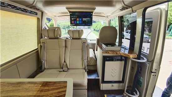 窗帘内侧可以加装LED蓝色灯光,车内立柱加装LED灯光,台阶上也可以镶嵌LED灯光,显示品牌坐标等。同时还可以在通道来两侧增加LED蓝色灯光。我们都知道,光是最能衬托氛围的选择,对车内灯光的改装可以带给我们独特的视觉感觉,营造出或温馨或者淡雅的乘车环境。