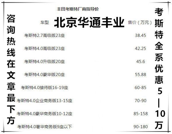 丰田考斯特厂商指导价(北京华通丰业)丰田考斯特4.0高级版42.25丰田考斯特4.0行政版45.6丰田考斯特4.0升级版47.8丰田考斯特4.0豪华版55.8丰田考斯特19座定制版60-75丰田考斯特18座定制版60-85丰田考斯特17座定制版70-85丰田考斯特16座定制版70-90丰田考斯特15座定制版75-100丰田考斯特14座定制版80-110丰田考斯特13座定制版90-140丰田考斯特12座定制版95-180万。丰田考斯特、9座、10座、11座、12座、13座、15座、16座、17座、19座、20座、23座现车销售, 豪华内饰改装。考斯特整体造形雅观,内部改装构造充实思量与丰田考斯特整车的均衡,每位搭客能切身体会尊贵。