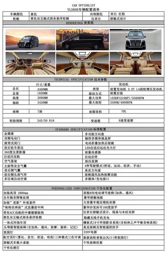 整车配置单可供您更加详细了解奔驰VLS600星影商务车
