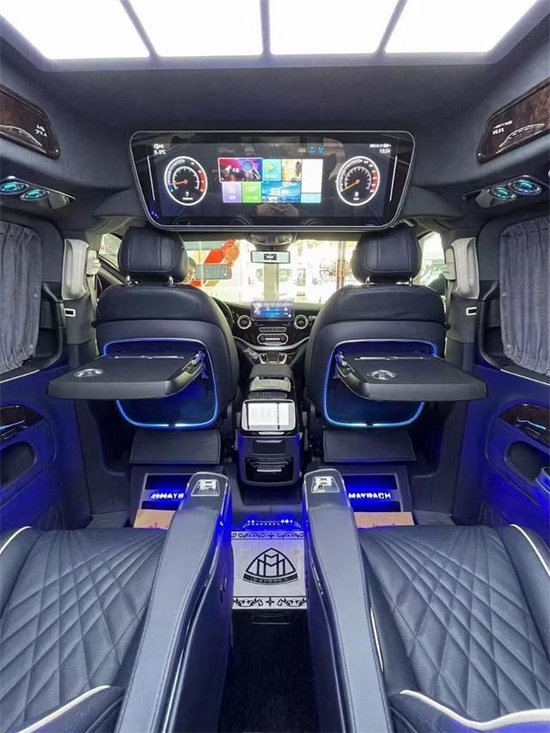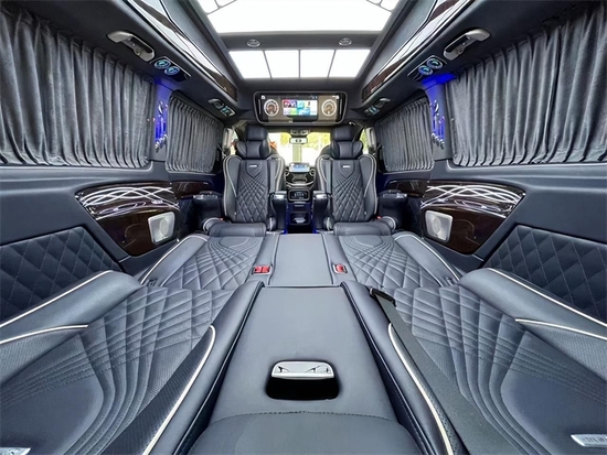 第三排座椅为标准的电动沙发座椅,可以通过隐藏在靠背中部扶手上的控制屏对座椅的靠背、底部的滑轨进行控制调节,必要时可以完全放平,形成一张豪华双人大床。奔驰威霆改装商务车绝佳的空间设计,让商务出行更加舒适放松,可调整的座椅设计能根据实际需求灵活改变,满足各种类型的使用需求。