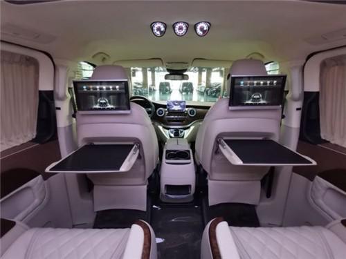 进口奔驰V250 商务车改装商务七座高级配置:前后舱双电池供电系统,GPS全球卫星导航系统带倒车影像,驾驶舱便携式电子冰箱,贵宾舱冷暖气分离出风口,进口奔驰V250 商务车改装改装商务车前后舱双空调独立控制系统,一键式超静音32寸高清液晶升降电视,日本健伍5.1影院级音响系统,220v电源接口USB.VGA多功能连接口,车载触控屏中控系统,车载智能空气净化器,全车豪华雀眼枫木装饰,全车柚木铝质地板,意大利进口Alcantaran麂皮绒顶,对于商务谈判与居家来说,这一切的配置都来得恰到好处。