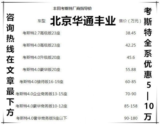 丰田专卖店新款柯斯达 (配置|询价)、考斯特、9座、10座、11座、12座、13座、15座、16座、17座、19座、20座、23座华通丰业现车销售, 豪华内饰改装。丰田考斯特11座至尊版、柯斯达12座(奢华版、旗舰版、VIP版)13座(VIP版、超VIP尊贵版、至尊旗舰版)16座(超VIP版、超VIP商务版)17座(VIP版、超VIP商务版)颜色米黄金属色、合格证与座位相符!