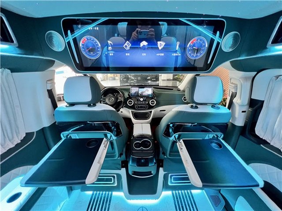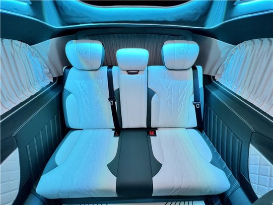 改装升级后的内饰更是高级感十足,全车大量使用真皮包覆,柔软舒适。驾驶舱升级为奔驰V级 (配置|询价)中控台,搭配12.1英寸的高清大屏、 桃木多功能方向盘、内置360全景影像系统、涡轮出风口,带有车载冰箱的多功能扶手箱,以及正副驾驶位的多向电动调节座椅。