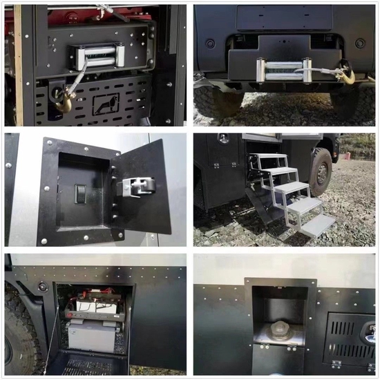 重汽豪沃无疆飞桥升顶式4X4越野房车配备有方舱专用全铝遥控乘客门、手动纱门、越野房车专用双层铸铝外推窗、3.5米进口自动电动风感遮阳篷,电动液压上车踏步、驾驶室顶置行李箱、泓晟达 3000W发电机、电动摩托车架、外挂行李箱、外抽拉烹饪灶台、12000磅前绞盘+20000磅后绞盘、外接市电系统、车外淋浴器、清水箱注水口+水泵取水注水口、污水排放口、黑水箱存放口、中位金属保险杠、飞桥升顶露台、四方位影像+车内4路监控系统摄像头等全套户外生存设备。电动摩托车架、外挂行李箱、外抽拉烹饪灶台、均为车尾一体的电控升降设计,离地非常高,即使涉水,也对设备没有危害。