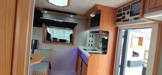 车内右侧,整体为厨房区,不过以房车中门隔开,左侧为烹饪、储物、冷冻功能,右侧为洗菜、储物、加热功能。左侧功能配备有152升进口赛特福德房车专用冰箱、电磁炉、调料存储区、进口房车专用抽油烟机、折叠菜板以及多层厨具储物柜。右侧配备微波炉、洗菜池、储物柜,洗菜更方便,并且可以存放更多物品。