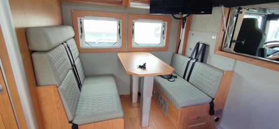 车内左侧客厅,设有两排超纤软包卡座+一张电动升降餐桌,座椅均配备有安全带,在人多时,客厅可拼接一张尺寸为1900*1000mm尺寸的单人床。客厅装配有多组储物柜,并内置三菱重工单冷变频空调,以及两扇复古内饰设计的通风换气窗。后侧悬挂一台液晶电视,连接车内配备的雅马哈音响系统,为旅行生活增添一份精彩。而在底部,则配备有整车所装载的伟巴斯特暖风加热器的出风口。