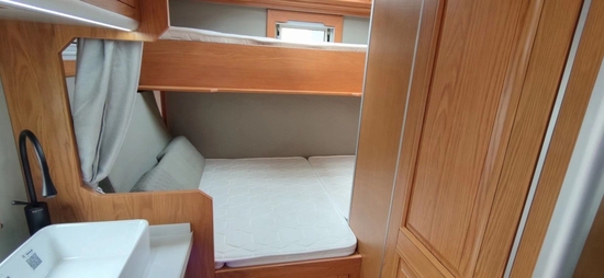 车尾横置折叠上下铺,作为主卧不仅空间宽敞,通风性能也不错。上床铺尺寸为2400*730mm,下床铺尺寸为2050*1000mm。同时床铺还配备有独立照明、通风换气窗、电源插座等功能。在床内侧,另配备有一组储物柜,用于存放衣物等贴身物品。上床铺还可抬起,使使用空间更为充足。
