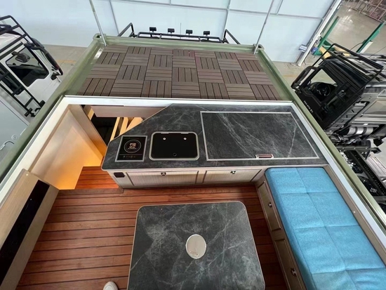汕德卡进入露台区,整体布局为L型沙发+手动升降座+整台厨房。如此一来,用户在露台赏景、制作简餐、品味咖啡竟成了十分惬意的事情。特别是相对完整的厨房配置,不仅有电磁炉,旁边还开设了带盖洗手池,免去了用户上下楼洗菜、洗手的烦恼。电路方面,乔翔汕德卡重卡房车根据不同价位分别搭载200、400、800、1200Ah锂电池组+5000W逆变器组合,此外400W、600W、1200W太阳能板也将配备在不同车型上。