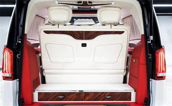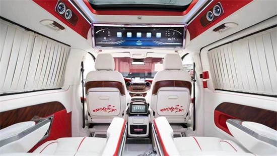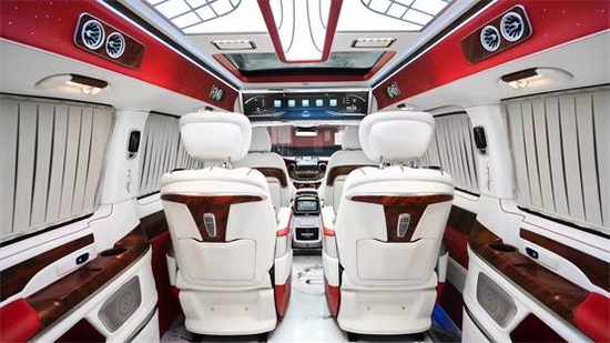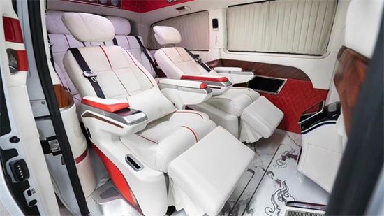 奔驰V250版以下是贵宾舱二个总裁座椅,这二个座椅具有记忆功能,何为记忆功能呢?就是一键展开及一键收回,这个座椅是根据人体工程学设计而成,能一键式找到您身体最舒适的角度。在总裁座椅双侧有两个隐藏式桌板。总裁座椅中间有个热感电子触摸屏幕可控制后舱设备,屏幕下方有个“语音控制系统”也可控制整个贵宾舱的设备。