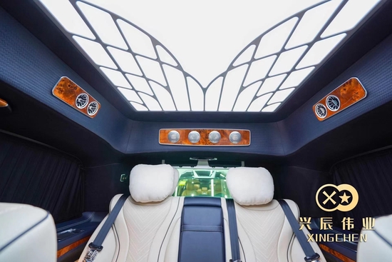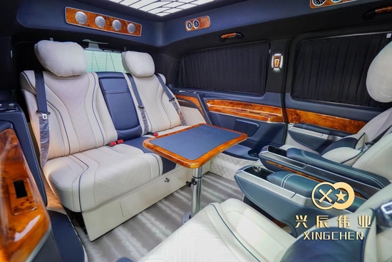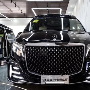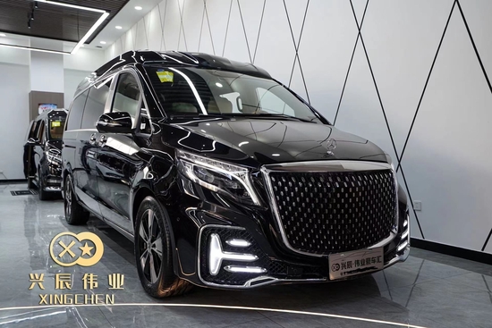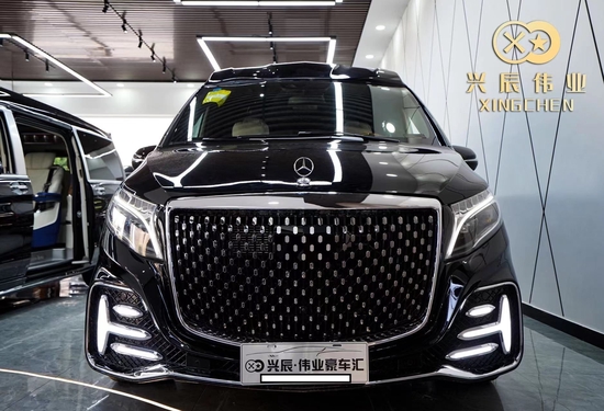 新车基于新款的奔驰V级 (配置|询价)升级定制,前脸进气格栅是烫银电镀,镀铬件装饰,两侧鹰眼大灯向后延续,显得非常有神。侧“T字”型的雾灯,又让整体霸气更收敛了一点,多了几分的稳重。