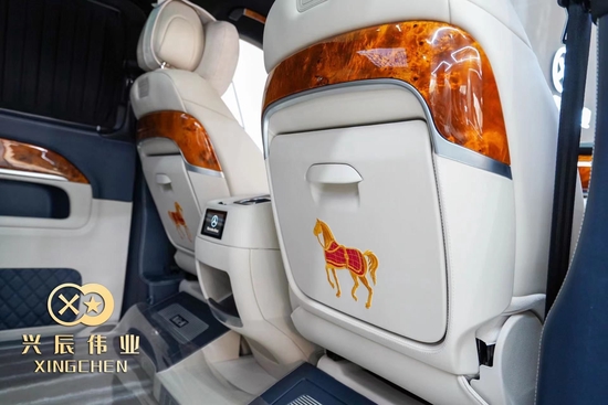 进入到乘客舱,本车是由德国奔驰总部的设计师Nick经过5个月的制作,可以看到车在迎宾踏板和脚踏处都有他的名字,主副驾后方两匹金马寓意你马到成功,融合的本土文化更符合国人的审美,也能彰显设计师的用心良苦。打开我们的马到成功是一副小桌板方便你在车内用餐办公,下方脚踏打开可以放雨伞、拖鞋等等,可谓是一举两得。