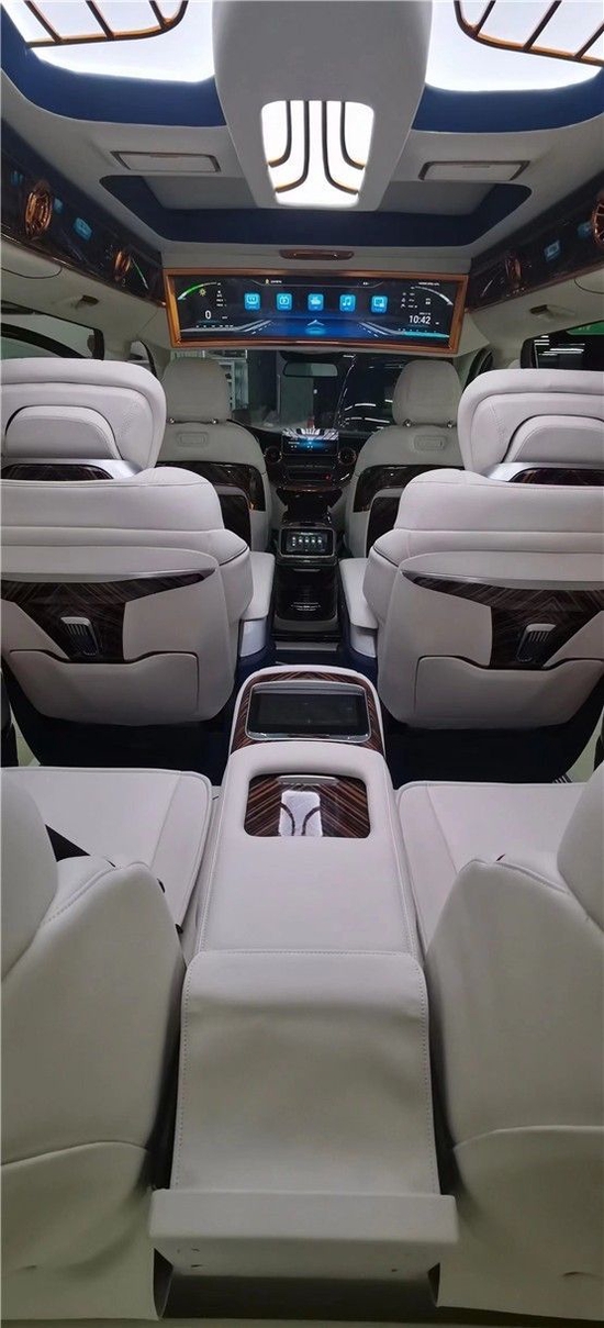 奔驰VS680改装整车加装了登车踏板、全车镀铬套件、LED迎宾踏板、LED灯饰及油漆同色,使整车更加尊贵霸气。竹苞松茂的时尚窗帘,8偏向电动调治按摩航空座椅,座椅阁下的文娱节制中隔屏,车内电器可任意一键操纵,可开启式全景天窗,在浩大的夜景中,共同“满天星”格调,好像在豪华的宫殿。vs680