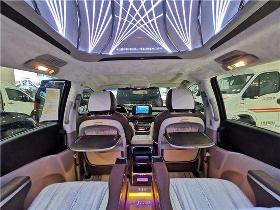 车高光镜面亚克力地板带有艾维亚标识,顶部麂皮绒包覆的顶棚,让您在车内乘坐感受到豪华、惊艳绝美的氛围环境。
