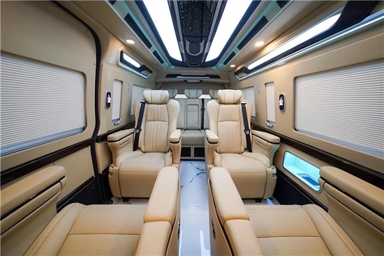 丰田海狮9座商务车采用2+2+2+3四排九座的设计,第二排和第三排均配备了两个Ottoman航空座椅,第三排放一张三人座的沙发床,即宽敞又实用,这样的情况下后备箱还能垂直放下四套高尔夫球装备!空间大才是真的王道。 华通丰业除了空间优势外,豪华性方面真皮、木质以及烤漆饰板的加入使得新车的内饰更具豪华度,车顶的设计时尚、大气,装彩色航空顶灯,星空顶,流水灯充满着奢靡的味道,点亮后车内的氛围是其它商务车所不能比拟的,也是的丰田海狮在内饰的环境上展现出与众不同的色彩,家庭出游必备首选。