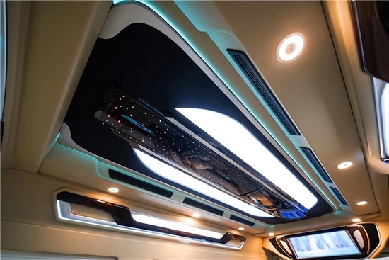 丰田海狮的航空座椅有着超乎寻常的尊贵感和舒适感,侧壁更换意大利顶级真皮包袱手感极佳,侧壁菱形格的设计使整车层次分明立体感更强。侧窗豪华电动窗帘,面料阻燃隔热、隔光、隔音。顶棚更换意大利顶级麂皮绒零污染零伤害的环保材质,搭配桃木件及氛围灯的组合,营造出温馨舒适的乘车环境。