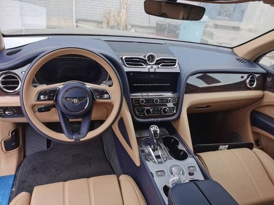 2022款宾利添越的内饰让整个车内豪华气息更浓,大面积的真皮和顶级实木,均为手工打造,真皮包裹的方向盘手感无与伦比,配备12.3英寸的液晶仪表和10.9英寸的中控屏幕,不仅科技感十足,而且显示效果更出色。顶部空调出风口的样式由圆形变成了飞翼式造型,中间的石英钟继续保留。