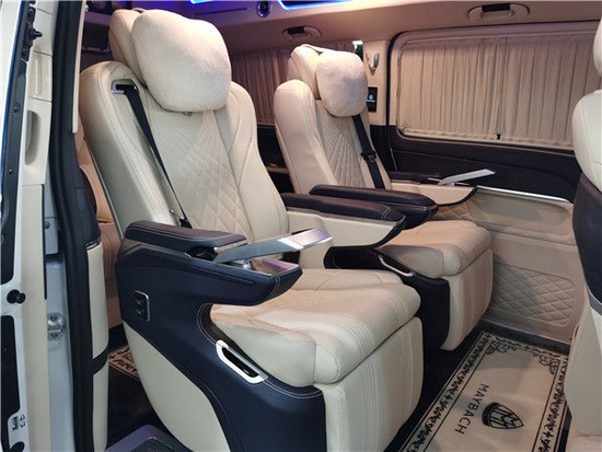 2021款奔驰V260改装商务车第二排航空座椅为带电动、加热、按摩、通风功能的航空级首长席,可沿着地面上滑轨实现一键电动式前后滑动,小范儿对于这种智能化的乘坐体验,是原厂车型笨拙的手动拖拽模式所望尘莫及的。车内的氛围灯打开后,奔驰V260内舱变得灵活多变,气氛也可以根据主灯颜色变换而变化,主要的乘坐座椅配置的独立的按摩功能,通风加热,一体腿托,功能丰富,乘坐舒适,是商务接待用车的代步良品。