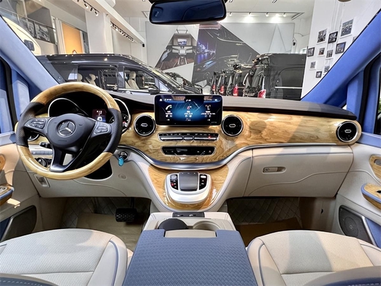 三幅式方向盘以及炮筒型的仪表盘看起来较为运动,133同2195时6679方向盘配备换挡拨片,此外,音响控制、巡航定速系统、电话系统都集成在方向盘上,使驾驶者可以方便控制车辆,这款商务车的驾驶舱也继承了奔驰精致的高品质,增添了时尚流行元素,中控台最具视觉冲击的就是它独特上等梨花木设计,颠覆级全新内饰整体吻合豪华的风格。