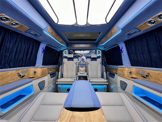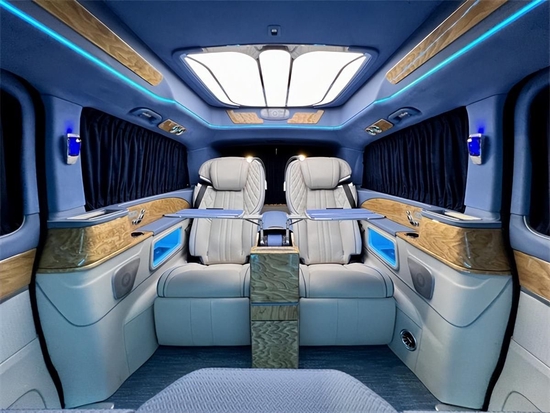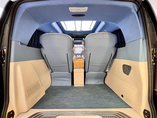 娱乐性功能体现倒也是别具一格,32寸升降液晶电视也被首次引入奔驰V260房车的设计,此外前、后置高保真音响组合立体环绕式声场,一套移动式家庭影院的私享配备。前后舱无隔断设计应该属于更偏向于家庭化的设计了,驾驶舱扶手箱后侧多是一些实用的功能体现,诸如恒温杯托、后舱电器触控屏等;那么如果是多用于商务接待,全隔断式的奔驰V260房车是个不错的选择。