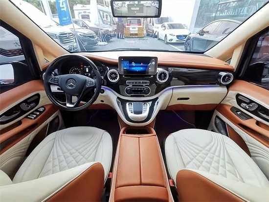 驾驶室整体换装也是比较大的,升级了奔驰V级 的悬浮式中控,迈巴赫涡轮出风口,具有非常高的豪华感,这款车主副驾驶座椅升级多项电动调节与加热功能,可任意调控的温度的车载冰箱,真皮包覆的中控台与奔驰钟表,彰显了这款奔驰威霆的独特设计与尊贵感。