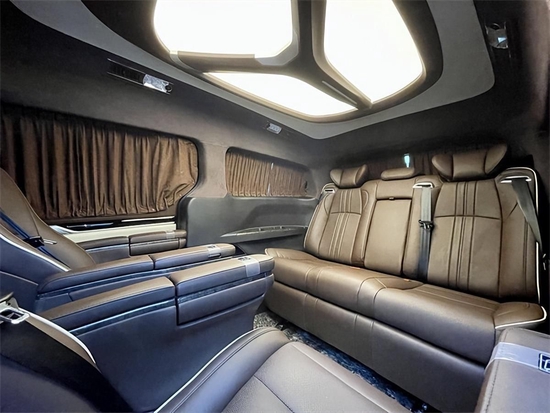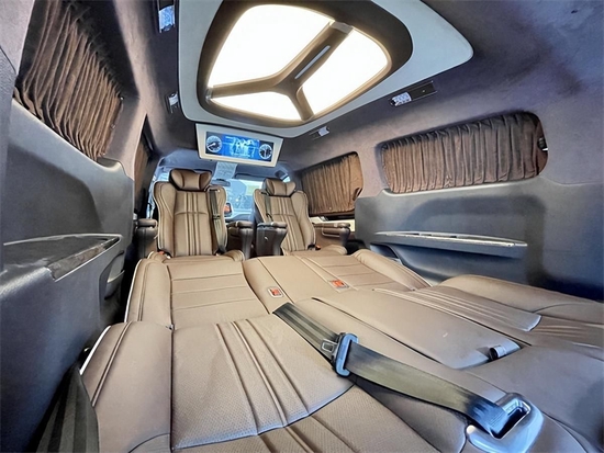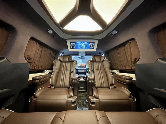 除此之外,后排还配备有高清宽幅网络电视以及麂皮绒制作的高级私密窗帘,像是一个移动的小型私人影院,旅行途中再也不无聊啦!商务接待的时候,还可以循环播放公司的宣传片,是一个绝好的展示公司形象,加深客户了解的机会哦