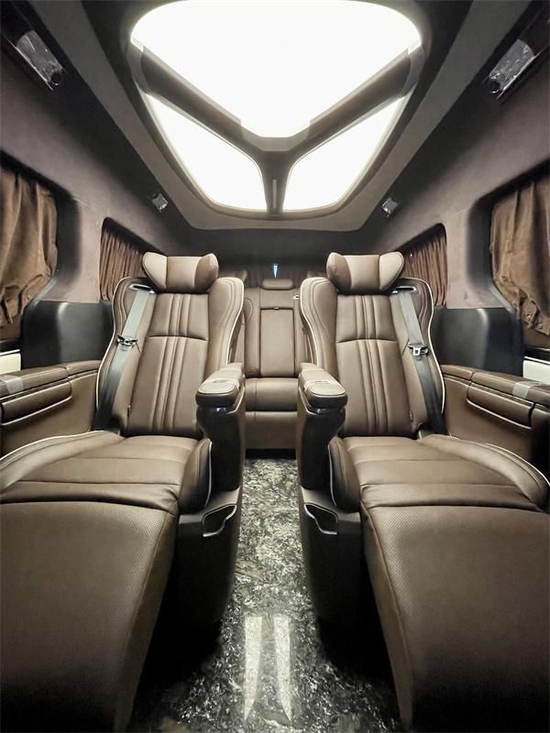 三连排的电动沙发床,可以180度放平成床,中间的触摸屏可以调节座椅的前后以及靠背。尾部留有宽阔的储物空间,配合上高级的私密窗帘,以及完美的隔音处理,可以为您工作之余的休息提供便捷与舒适。这样一台在35-40W价格区间之内性价比可以说是十分高的。不知道你是否喜欢呢