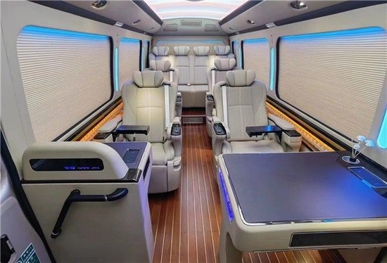 丰田考斯特车内的窗帘的设计上丰田考斯特也充分考虑了内饰设计的独特性,豪华的布艺窗帘以及大气的电动百褶窗帘, 华通丰业丰田考斯特改装商务车在内饰设计上充分展示出了自己大气的风格设计。