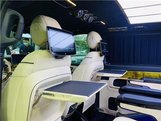 把座椅旋转过来给大家看看,够舒适吧。奔驰V260L圣母峰商务车全车搭载了立体声道环境音响,多色的可调式氛围灯也让后舱的豪华感更加的丰富。奔驰V260L圣母峰迈巴赫式顶灯线条分明,打开隐私窗帘,车里妥妥的是您的私人办公室-奥里给!!!整车门板侧壁单独开模具设计,满满高级感