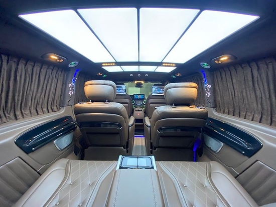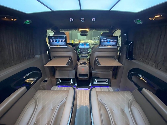 新威霆改装商务车规划给人以极佳的空间感,使商务旅行更加舒适和放松,豪华改装过的MPV根据实际需要进行了灵活改装,以满足各种类型的需求,满足商务招待、洽谈、出游等各种类 奔驰威霆改装车的核心区域-后座舱,主要是商务棕色为主,以符合车主的沉稳和从容的个人气质。