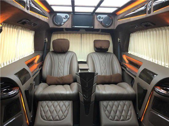 奔驰V260L改装隐藏六座全隔断商务车,后排座椅采用两个迈巴赫62S首长级座椅,带加热,按摩,通风,一键式电动调节记忆等功能。范经理奔驰V260L改装高顶隔断商务车座椅符合人体工程学设计,同时带有电动椅背调节,电动头枕,电动前后调节,一键式伸缩腿托功能,带来头等舱级舒适体验,私家客厅级后舱体验。