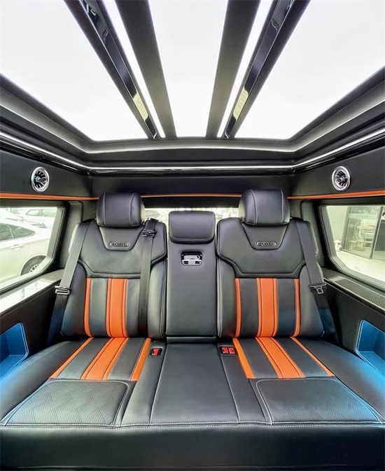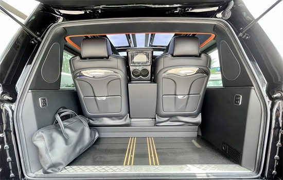 两个独立的航空头等舱按摩座椅,配有通风、加热、按摩等十二项电动调节功能,让我们在乘坐过程中有舒适的乘坐体验。顶部半隔断的车载无线网络电视机,全车10个进口BO音响系统,再配合顶部天窗和后部的三色宫格顶灯相结合,搭配整车的线条式氛围灯,凸显整车的层次感,也烘托了整体的氛围。