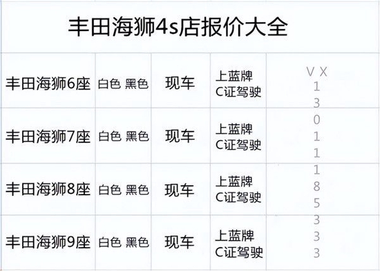 原装进口丰田海狮6座、丰田海狮7座、丰田海狮8座、丰田海狮9座丰田海狮10座版、华通丰业丰田海狮11座版、丰田海狮12座版、丰田海狮13座版,更有可上蓝牌照的丰田海狮6座、丰田海狮7座、丰田海狮8座、丰田海狮9座,华通丰业专业改装航空座椅,北京现车最低价格。感兴趣的朋友不妨关注一下。