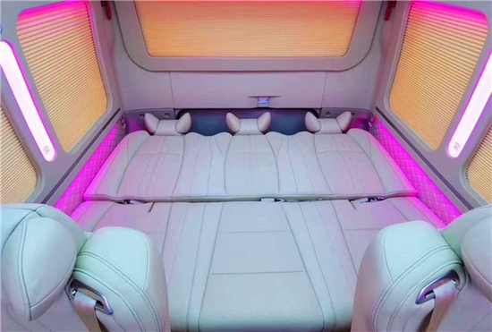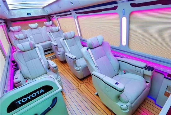 首长席航空座椅:高档首长座席由真皮航空座椅构成,根据人体工程学设计的弧度,使人体乘座更加舒适、贴切。让更贴合乘客的移动办公需求,让领导感受超乎寻常的尊贵感和舒适感侧壁更换蒙皮:侧壁更换意大利顶级真皮,手感舒适,侧壁菱形格的设计使整车层次分明立体感更强。