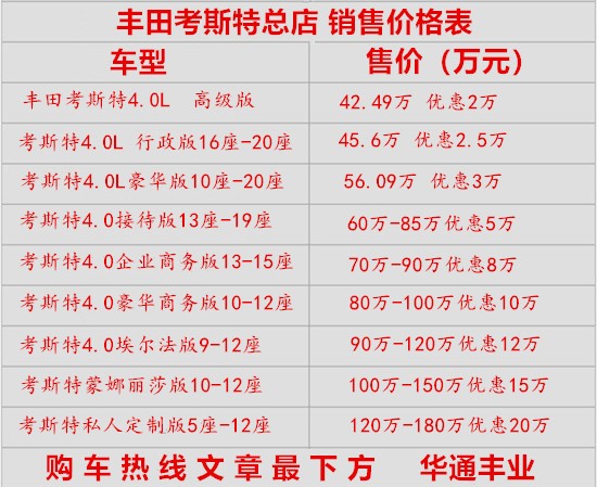 丰田考斯特现车12座多少钱 12座最低价格 丰田考斯特价格-丰田考斯特12座价格-丰田考斯特12座报价-丰田考斯特12座多少钱-丰田考斯特12座接待版售价全国上牌,统一出场合格证〉大量现车,全国最大最专业的丰田考斯特销售改装大厂,全系低价售全国,全国上牌!