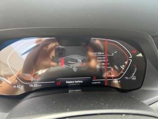 22款宝马X7内饰部分,宝马X7采用最新家族式设计语言,使用大量真皮、木纹饰板进行包裹。配备12.3英寸带有注意力检测的全液晶仪表和12.3英寸悬浮式触控显示屏。空调出风口与温度显示屏、实体功能按键结合在同一区域,并使用银色装饰条进行点缀。下方盖板下方为带有加热、制冷功能的杯架,全新的水晶电子挡杆造型十分精致,进一步提升了车内的豪华氛围