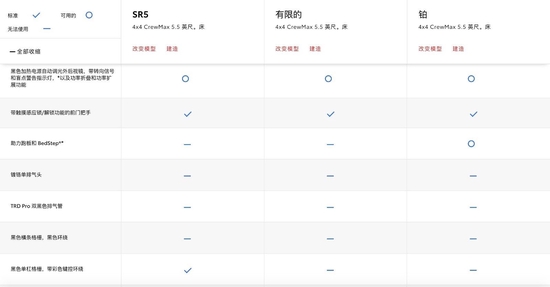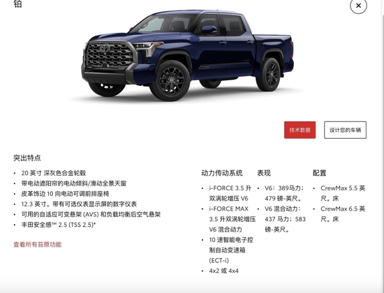 标配:分时四驱、雷测、倒影、织物座椅、一键启动、自动远光灯、双光束LED大灯、带有手动水平控制的前照灯、加热外后视镜、带自动制动功能的直观泊车辅助系统、盲区检测(带后方横向交通警报系统和倒车侧向交通警报系统)、自动远光灯、带转向辅助功能的车道偏离警报、车道追踪辅助、带防险紧急转向辅助系统的预碰撞系统、行人预碰撞系统、转弯迎面而来的行人检测/制动、星级安全系统、带自动定位功能的胎压监测系统、智能互联、9扬声器、重型牵引铰接接收器、油压表、前隔音挡风玻璃、电动后窗除霜器、后窗隐私玻璃