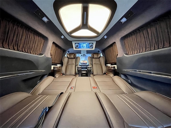 除此之外,后排还配备有高清宽幅网络电视以及麂皮绒制作的高级私密窗帘,像是一个移动的小型私人影院,旅行途中再也不无聊啦!商务接待的时候,还可以循环播放公司的宣传片,是一个绝好的展示公司形象,加深客户了解的机会哦!