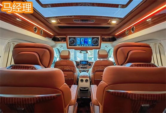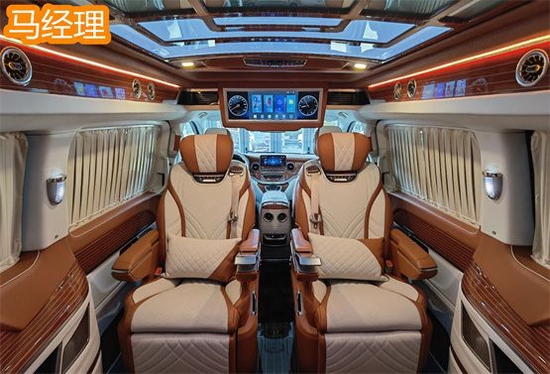 奔驰V260L版以下是贵宾舱二个总裁座椅,这二个座椅具有记忆功能,何为记忆功能呢?就是一键展开及一键收回,这个座椅是根据人体工程学设计而成,能一键式找到您身体最舒适的角度。在总裁座椅双侧有两个隐藏式桌板。总裁座椅中间有个热感电子触摸屏幕可控制后舱设备,屏幕下方有个“语音控制系统”也可控制整个贵宾舱的设备。