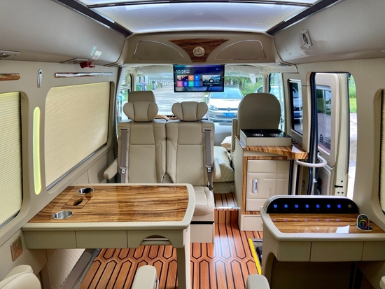 丰田考斯特改装15座商务车改装商务车尤其注重实用性的设置,高档的办公桌,双人汇报席,固定秘书席位。最突出的特点是我们对于车厢内冰箱和酒柜装饰,这些装置与司机驾驶席后的显示屏隔断,将车厢与驾驶席隔开,我们可以在隔断的中间增加电动门,方便来回的交流和沟通。
